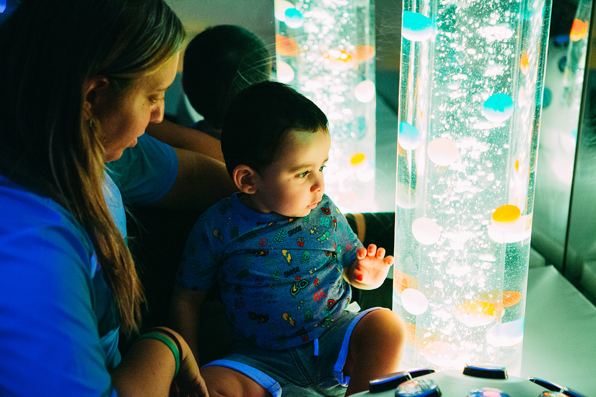 La Sala Snozelen cuenta con tubos de burbujas, proyector de colores e imágenes, piscina de bolas, fibra óptica, cama de agua, sistema de luz negra, difusor de esencias, sistemas interactivos WIFI, luces LED…